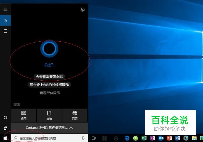 启动Windows 10操作系统,如图所示。点击任务栏搜索框,开始使用Cortana(小娜)智能语音助理。