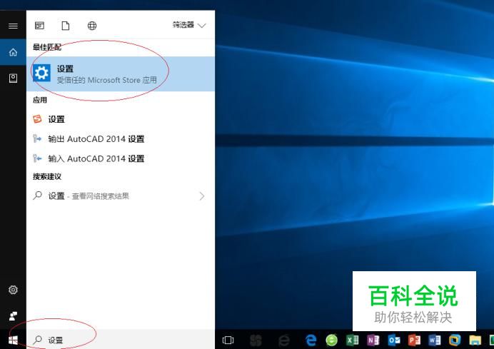 如图所示,搜索框输入"设置"。Cortana(小娜)显示搜索结果,点击"最佳匹配→设置"项。