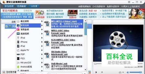 接着选取要转换的mp4格式,点击“预置方案”右边的“”按钮,然后在弹出的菜单栏上选择左边的“常用视频”,之后在右边的格式选项上选择转换的mp4格式。
