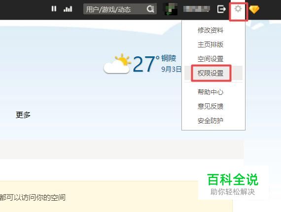 首先,我们登录我们的QQ空间,之后我们点击右上角的设置按钮,弹出的界面,我们点击权限设置;