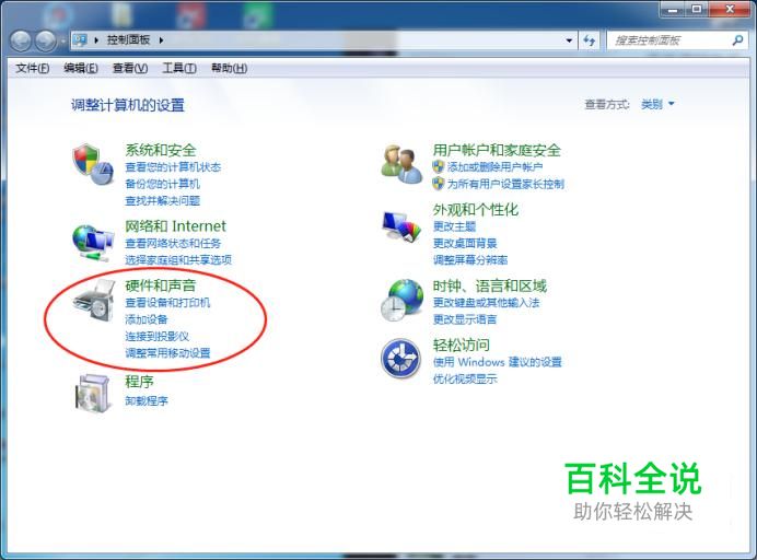 在打开后的页面选择硬件与声音选项