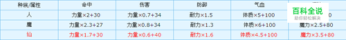 种族/属性命中伤害防御气血魔法 人力量×2+30 力量×0.7+34 耐力×1.5 体质×5+100魔力×3+80 魔力量×2.3+27 力量×0.8+34 耐力×1.3 体质×6+100 魔力×2.5+80 仙力量×1.7+30 力量×0.6+40 耐力×1.6 体质×4.5+100魔力×3.5+80