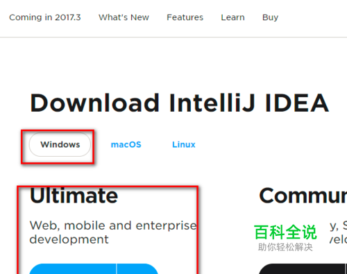 在搜狗搜索中输入IntelliJ IDEA进行搜索,进入官网后下载软件,IntelliJ IDEA有免费的社区版(Community Edition)和收费的旗舰版(Ultimate Edition),当然如果你是学生的话旗舰版是可以免费申请的。IntelliJ IDEA是一款跨平台的开发工具,支持windows、mac osx、linux,可根据需求下载对应版本。Ultimate Edition版本的功能更加全面,因此我们选择下载收费的旗舰版。