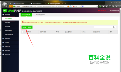 在前端界面,选择“公众号管理”,然后选择“新增”按钮