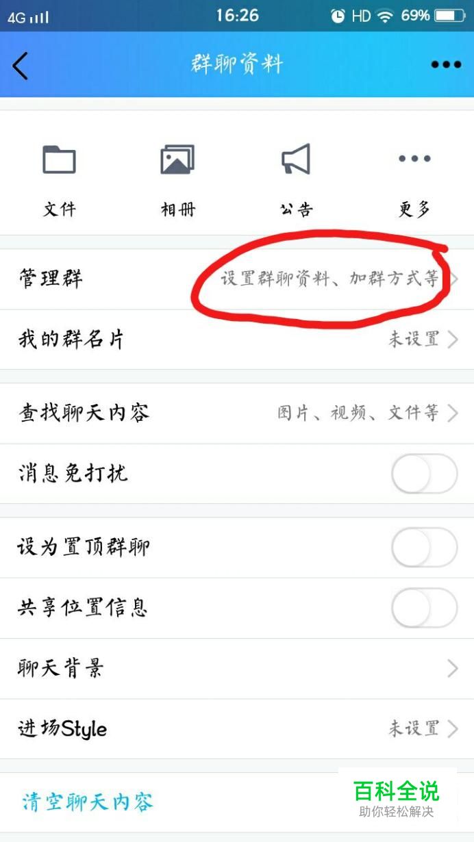 然后在“群聊资料”界面点击“管理群”设置群资料、加群方式等
