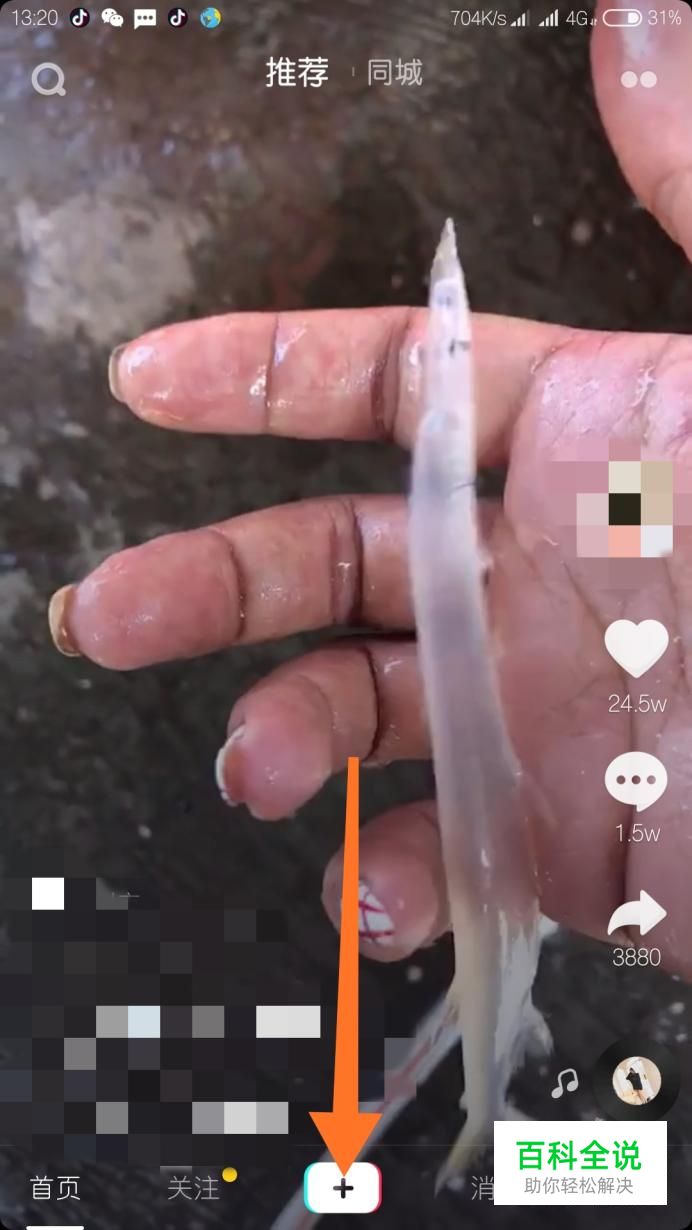 打开抖音短视频,点击屏幕下方中间的彩色加号,如图所示。