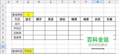 点击Q3单元格,录入公式“=班级项目查询!B1”。点击Q4单元格,录入公式“=班级项目查询!B2”。至此,基本的表格准备工作就算是完成了。