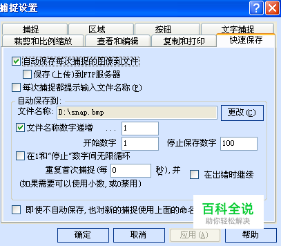 接下来是最关键的一个步骤,勾选“自动保存每次捕捉的图像到文件”,可以自己设置截图自动保存的位置,“文件名称数字递增”无需改动。
