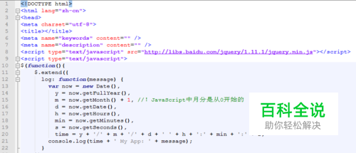 这里对jQuery的log对象进行扩展作为演示 $.extend({ log: function(message) { var now = new Date(), y = now.getFullYear(), m = now.getMonth() + 1, //!JavaScript中月分是从0开始的 d = now.getDate(), h = now.getHours(), min = now.getMinutes(), s = now.getSeconds(), time = y + '/' + m + '/' + d + ' ' + h + ':' + min + ':' + s; console.log(time + ' My App: ' + message); } }) $.log('initializing...'); //调用 如图。