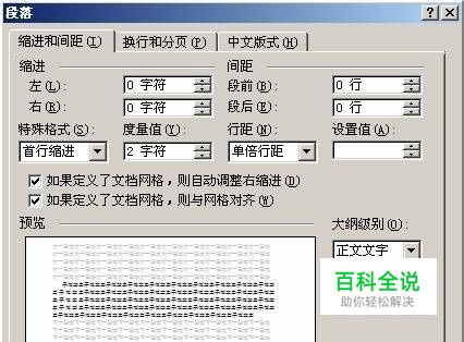 单击“缩进和间距”选项卡,单击“特殊格式”下拉箭头,从下拉列表框中选择“首行缩进”或是“悬挂缩进”方式,并在旁边的“度量值”框中设置相应的缩进量。同时可在预览窗口中即时看到预览效果。