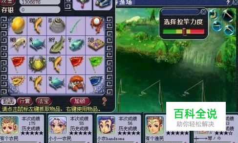 钓鱼前提示:买鱼竿,长寿村(95,109)或傲来国(186,64)。每天每号钓鱼时间为3个小时,3个小时后不能再使用鱼竿。钓鱼等级为:50级。 钓鱼前准备:力度选择栏打开就不要关上了,把它拖到右边,能够最快的选择力度后提竿,提竿后不管钓上来鱼没有,第一时间要把竿投到水中,然后把力度角度拉杆方式都调回初始的状态。 傲来钓鱼技巧: