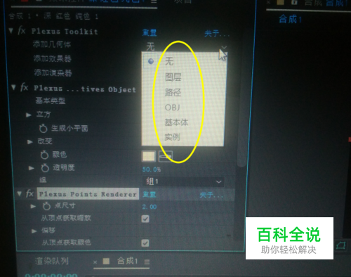首先创建一个合成,再新建一个纯色层。把Plexus加进来。有个“添加几何体”就是Plexus发射器来的。点开右边的选项按钮,有通过图层、路径、OBJ、基本体、实例这五种方式创建发射器。其中,OBJ是三维图形,就是你制作好的三维模型存为OBJ格式就可以导入AE中使用它,基本体是AE软件自带的发射器,有立方体和球面两种选择。实例的话就是可以加入其他素材。比如合成,文字层、纯色层等等。