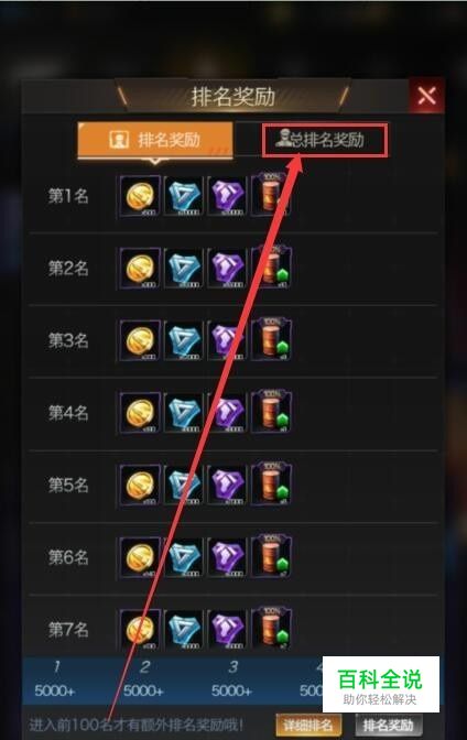然后在排名界面中点击右下角的排名奖励按钮。然后再点击排名界面右上角的总排名奖励按钮,如图所示。