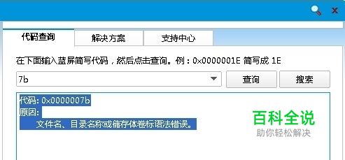 使用蓝屏查询器,经查:这个蓝屏错误代码的缘由是: 代码: 0x0000007b 原因: 文件名、目录名称或储存体卷标语法错误。