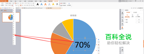 接下来对饼图进行编辑。选择开始,文本框,在页面拖出一个文本框,在文本框中输入数字,百分之70,