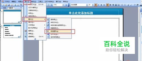 打开PPT,点击上方功能区中的“插入”,在展开的列表中选择“图片”,在展开的列表中,选择“自选图形”。