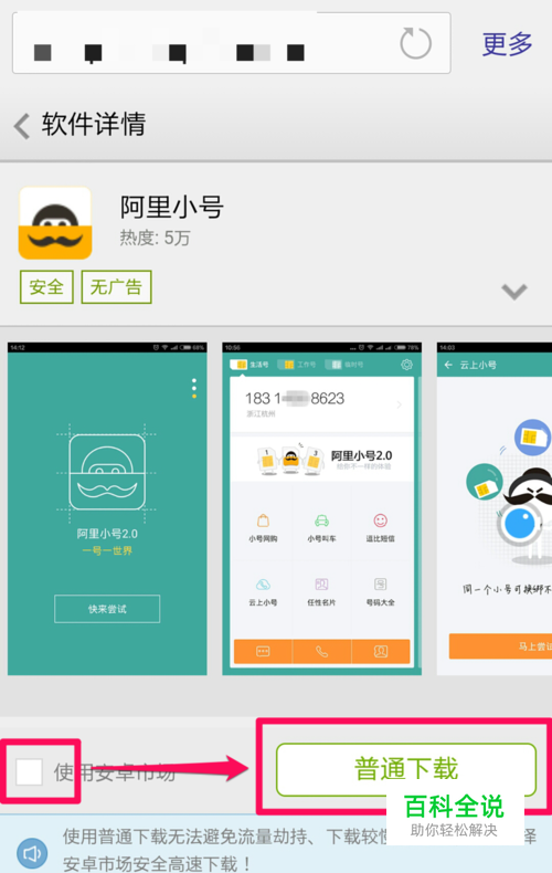 打开浏览器,搜索阿里小号,点击最上方的官方版免费下载,去掉安卓市场前面的对钩,就可以使用普通下载了。