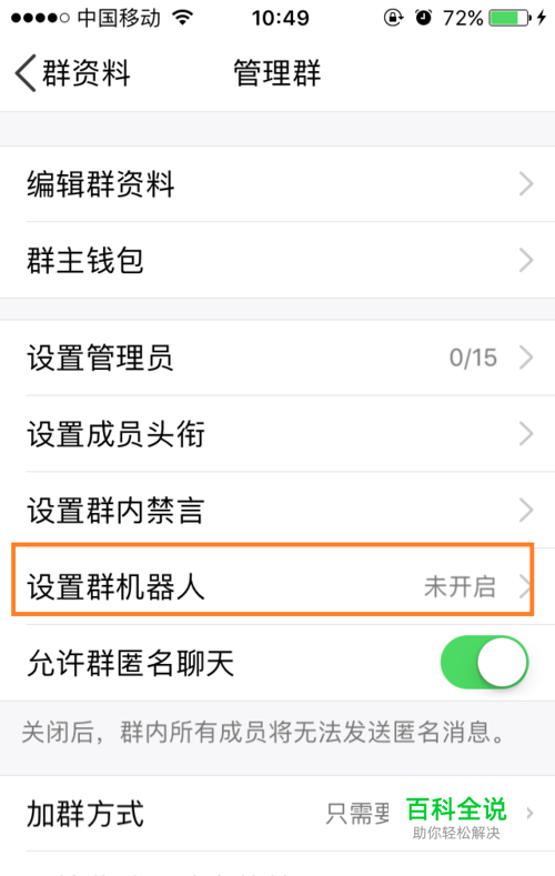 进入管理群后,找到“设置群机器人”选项