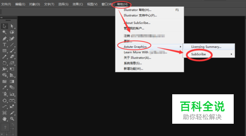 在AI软件上面的菜单栏中,找到【帮助】-->【Astute Graphics】-->【SubScribe】,可以看到AI已经成功安装了subscribe插件,如图: