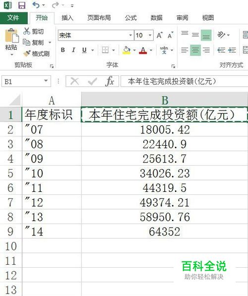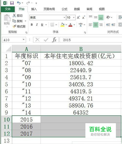 以一个例子来说明。如下图示,是A列是年度标识,B列是“本年住宅完成投资额(亿元)“现在已经知道07年到2014年的数据,那么要如何预测未来三年的数据呢?