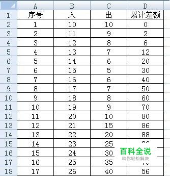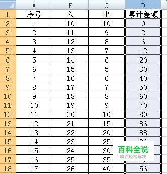 1. 下面用一个简单的表格来说明。如图,如果A列为序号,B列为入,C列为出,D列为B与C的累计差额,希望将D列中的最大值和最小值分别用绿色和红色突出显示出来。