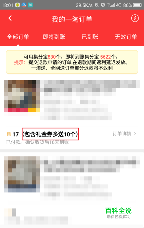 可看到最新提交的订单的返利信息,括号中就是用礼金券送的集分宝。集分宝会在确认收货后16天进行发放,在你以后购买东西时可直接抵扣。