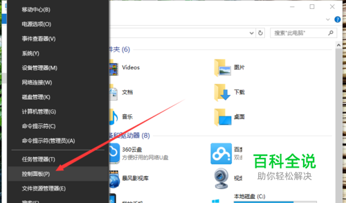 1、Windows10系统中,鼠标右键点击开始按钮,在弹出的菜单选项中点击“控制面板”选项。如图所示;