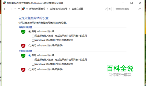 6、在自定义Windows防火墙窗口中,可看到“专用网络设置”和“公用网络设置”下的“Windows防火墙阻止新应用时通知我”被勾选。如图所示;