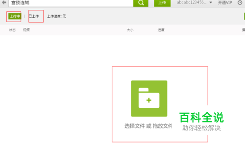 点击【选择文件或拖放文件】,选择你要上传的视频文件,在【上传中】和【已上传】可以看到上传进度