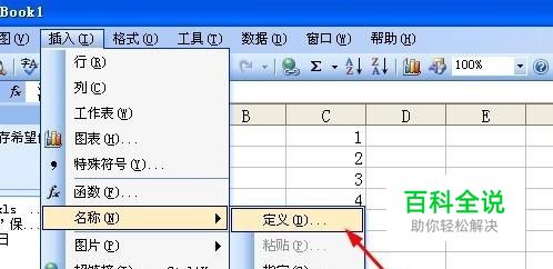 然后我们按住Ctrl键,选中测试数据文字部分的单元格,然后,单击“插入——名称——定义”。