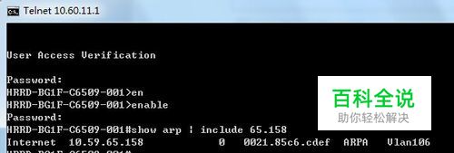 查看ARP缓存,并输入你要查找的IP地址的部分或全部内容。如果你找的IP地址包含65.158,可输入如下命令:show arp | include 65.158,可获得如下结果。并可知道对应的MAC地址为0021.85c6.cdef。