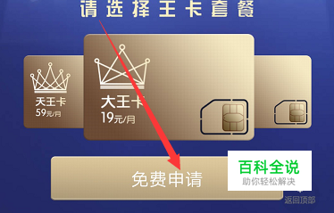 2、选择【大王卡】,点击【免费申请】,根据页面提示进行操作即可;