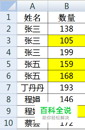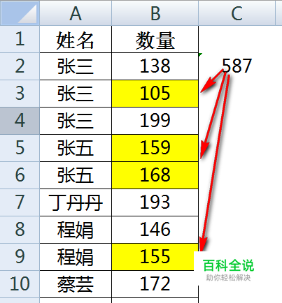 首先,看一下原始数据。 原始数据A列是姓名,B列是对应的数量。现在需要对黄色标注的单元格数量求和。