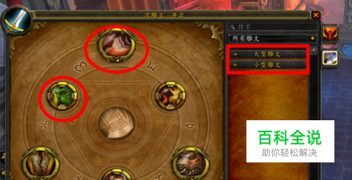 打开“雕文”属性窗口以后,左边显示的是雕文插孔,右边显示的是所有的雕文列表。其中雕文插孔分为三个大型雕文和三个小型雕文插孔,如图所示