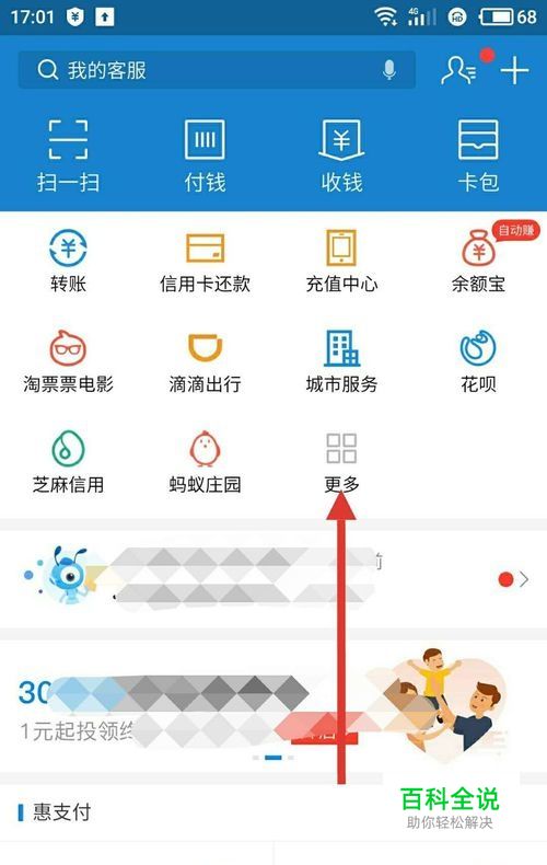 打开支付宝首页,点击中间位置的“更多”,如下图所示: