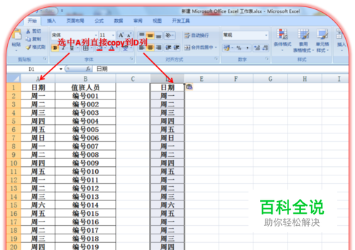 知道了函数的意思后,请大家一步一步按照箭头进行操作,首先复制A列到D列如下图: