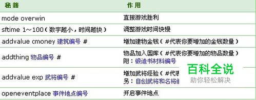 开启秘籍模式 在游戏最初界面,直接输入cheatmodeopen (不需要输入框,直接按字母)再按回车。如果输入成功会出现一条黑框,如图所示: 开放秘籍模式后,每次需在使用时,按下[Ctrl] 键,出现黑框,输入秘籍后回车确认。 具体编号请点击对应链接 一、大地图秘籍(在大地图下使用) 二、千人战秘籍:选择出战部队画面时用 三、千人战秘籍:进入战场画面时用 四、三国群英传7特别秘籍:在选择时期画面时用 可在“霸王再临”时期中扮演高祖刘邦或霸王项羽:useeventnation 注意事项: 1、如果打cheatmodeopen按enter无法出现黑色条 A、代表输入错误~请按[ESC键]再重新打一次 B、可能你输入法没变更为英文 2、秘籍模式中~要重覆呼叫出黑色横条 A、直接按Ctrl键即可(键盘右侧)~而左方那键无法使用 3、黑色横条输入秘籍时~数字间需打空格才能成立 A、举例幼麒麟一只 addthing(空格)225(空格)1 addthing=纳入道具秘籍 225=幼麒麟编号 1=1只