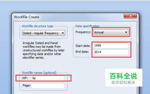 打开Eviews 7软件,依次点击上面菜单栏的【 File】——【 New】——【 Workfile...】,快捷键是“Ctrl+N”,这时候就会出现建立数据的界面。 我的数据是1999年到2014年的数据,类型就选择“Annual”,数据区间就是“1999 2014”;我们做的是什么就可以在“WF”里面自己命名成什么,其他默认设置就可以;完成点击【 OK】即可。