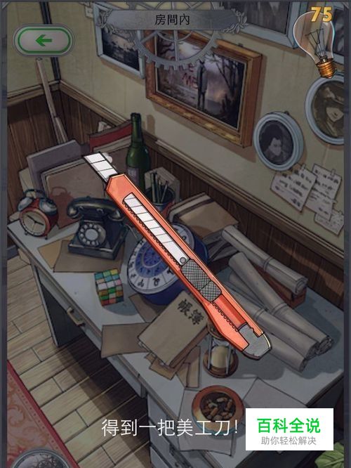 进入桌面,点击笔筒得到美工刀,桌子的第一个抽屉是什么都没有的,点击左下角的道具栏,选择美工刀,点击墙上SAVE ME的画,用美工刀割过去,得到双子座硬币: