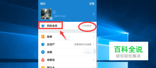 1.2 在我的首页上方,找到并单击‘蚂蚁会员’,这里能看见我们自己的会员积分。单击进到积分兑换页面。