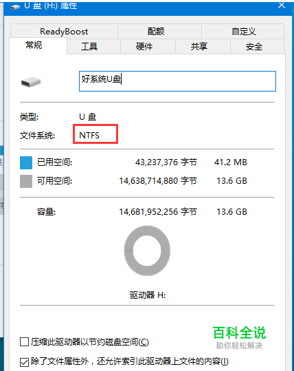 条件一:NTFS 目前好系统U盘启动仅支持NTFS文件系统的U盘。在U盘属性中可以查看U盘的文件系统格式。如下图。