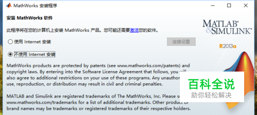 我们双击setup。exe文件,弹出安装mathwork软件选项,分别为:使用Internet安装和不使用Internet安装两种,我们选择不使用Internet安装。选择后点击下一步