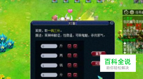 香料老板带你来到一个种满了药草的药圃中,根据任务提示找到相对应的药材。 这里需要注意的是每种药材需要采集的数量不一样,最上面显示需要多少数量,根据所需要的数量点击上下图标自行选择,比如这里的半钱就是五分。