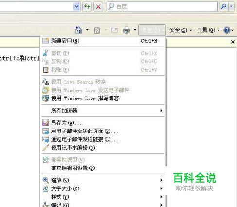 如果没有弹出阻止框的话,我们可以换种解决办法,点击IE浏览器右面的页面选项,然后点击查看源文件,同样能够查看禁止右键功能的网页的源代码.
