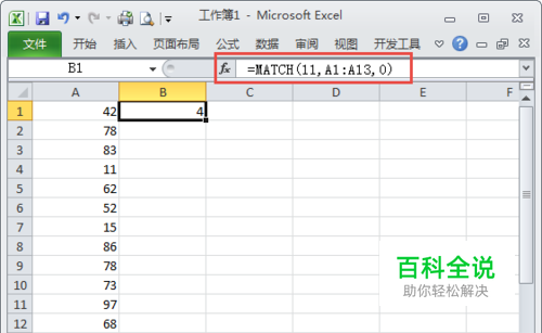 从图中目测可以得知11位于A4单元格,也就是从上到下的第4个数字。 我们可以通过Match函数来获得这个位置。公示如下 =MATCH(11,A1:A13,0) 如下图所示