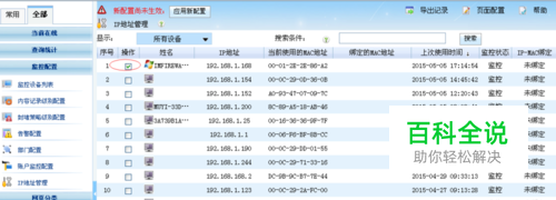 通过超级嗅探狗绑定IP和MAC地址 1. 在“IP地址管理”页面配置IP-MAC绑定 在超级嗅探狗的“监控配置”->“IP地址管理”页面,勾选您需要绑定的电脑,点击下拉菜单的“启用IP-MAC绑定”,再点击确认,应用新配置,就可以轻松实现绑定。