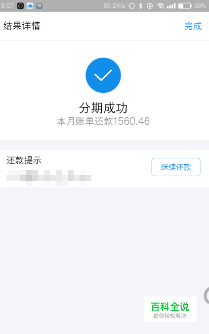 再次点击一下确认分期,接着弹出图二的分期成功,代表已经把贷款设置为了账单分期了。