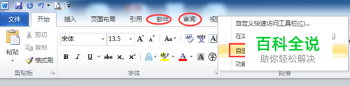 菜单栏任一按钮上如文件、开始、插入、引用等点击右键,弹出框中点击“自定义功能区”。