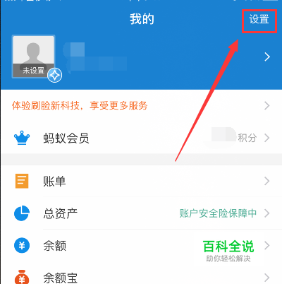 打开手机支付宝,点击页面右下方的【我的】,然后点击右上角的【设置】。