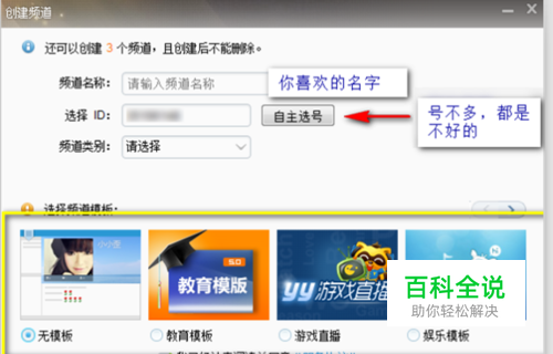 进入创建频道页面,输入 频道名称(随便写吧,想什么就写什么的); ID可以选择你喜欢的(不过不多是你自己选的,可以去签约,签约的比较好); 频道类型选择下(类型有四种,自己看是玩游戏还是唱歌的,根据自己需要选择); 模板也选择下(这个比较没什么用,随便吧)。